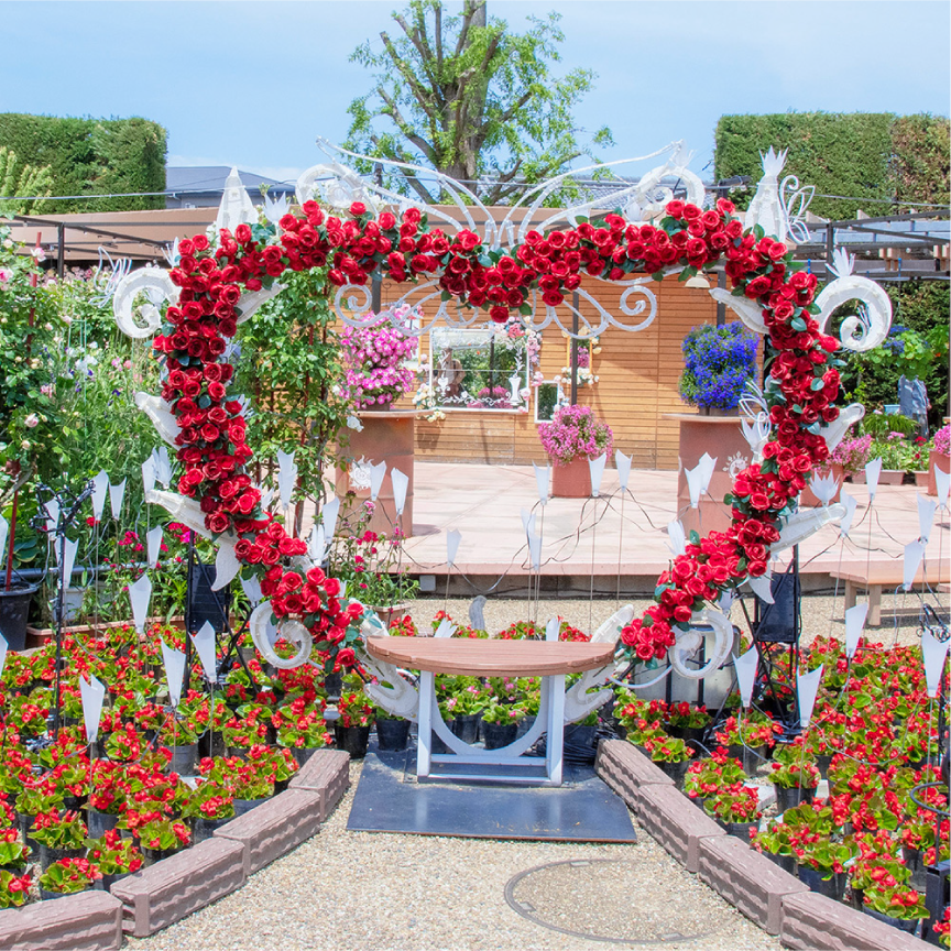 6本のバラのアーチ。色彩豊かなバラが私たちを優しく包み込み、暖かな太陽の日差しを浴びながらお散歩気分を味わえます。