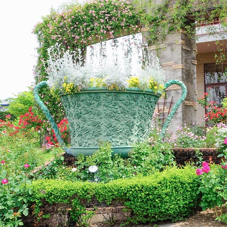 京阪園芸「東洋一のバラ園と岡本勘治郎」 外部サイト2000年(平成12年)のリニューアルで、現在の英国風「ローズガーデン」に生まれ変わりました。春しか見られない原種のバラや、つるバラ、花色・花形が豊富な四季咲き性のバラなど、約600種4000株のバラが咲き誇ります。